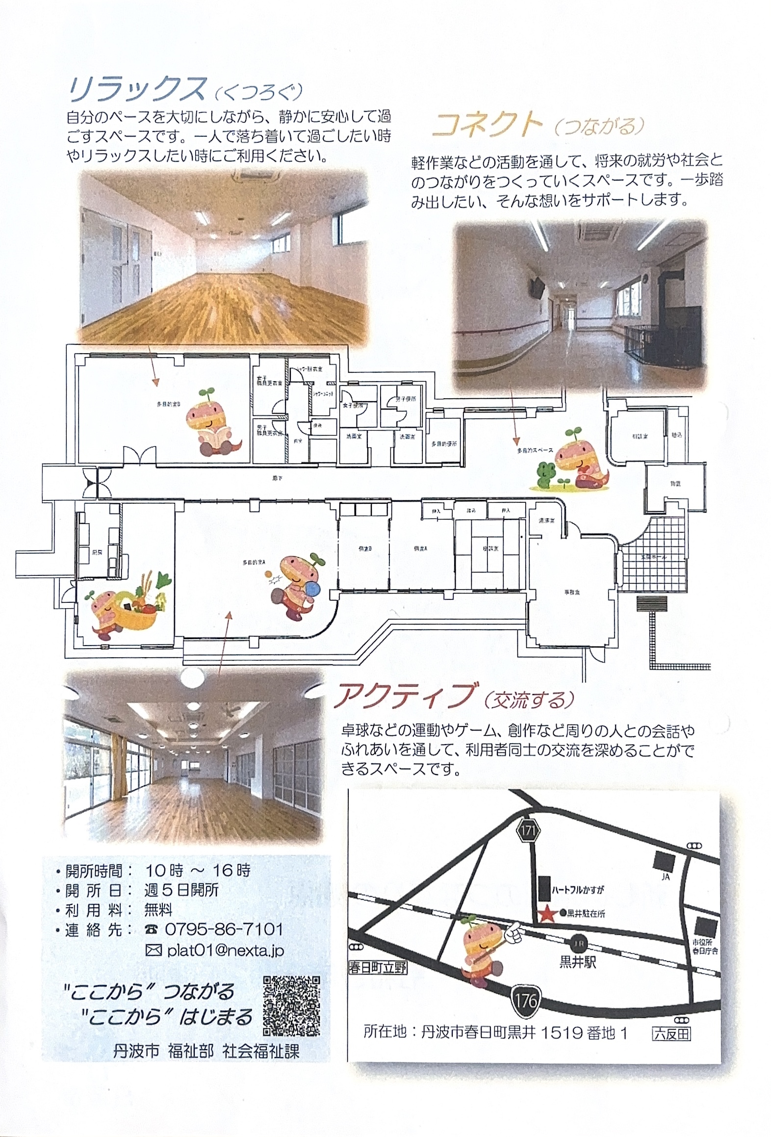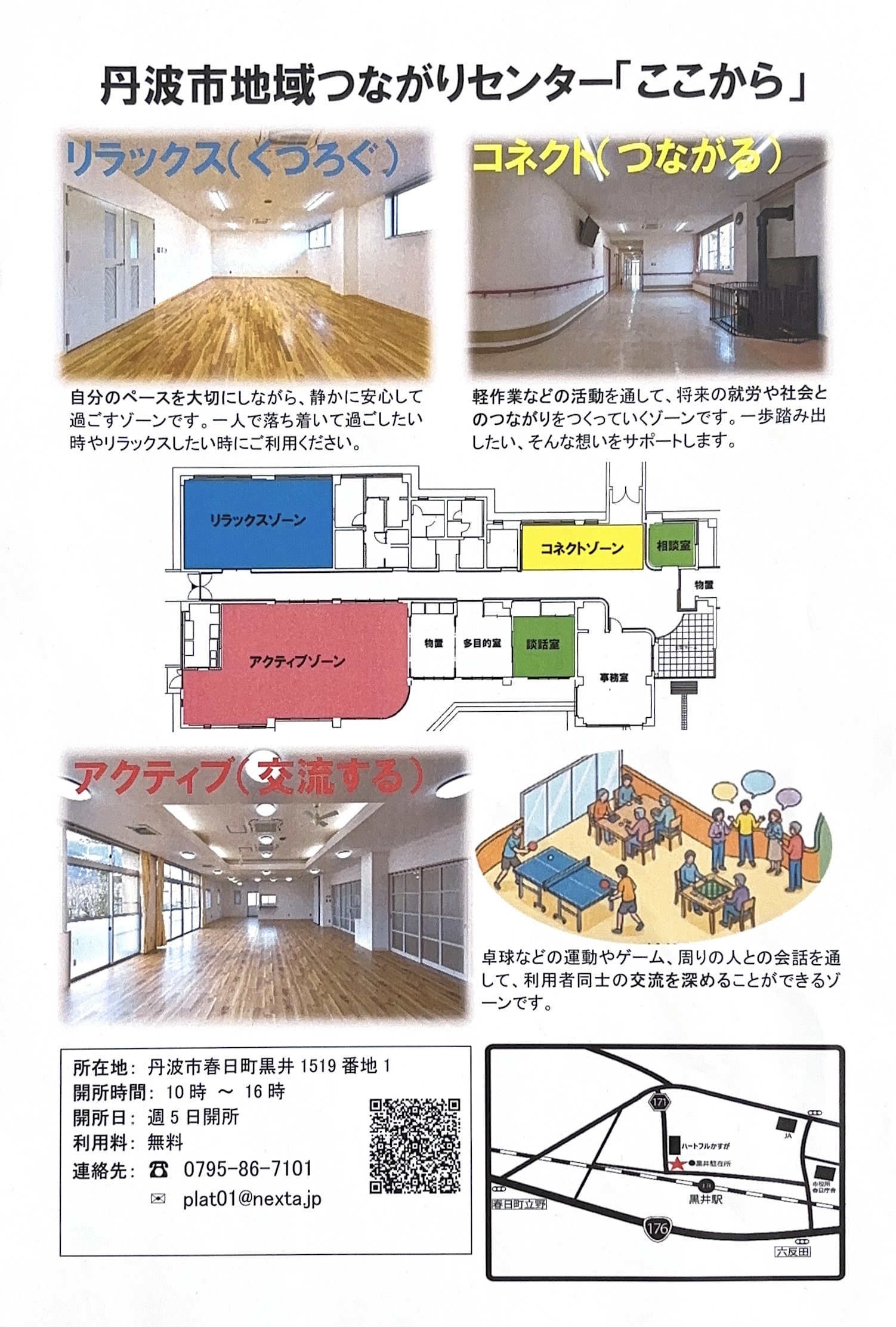 「丹波市地域つながりセンター ここから」は、本年3月より丹波市氷上町香良から丹波市春日町黒井(黒井駅前)へ移転します」