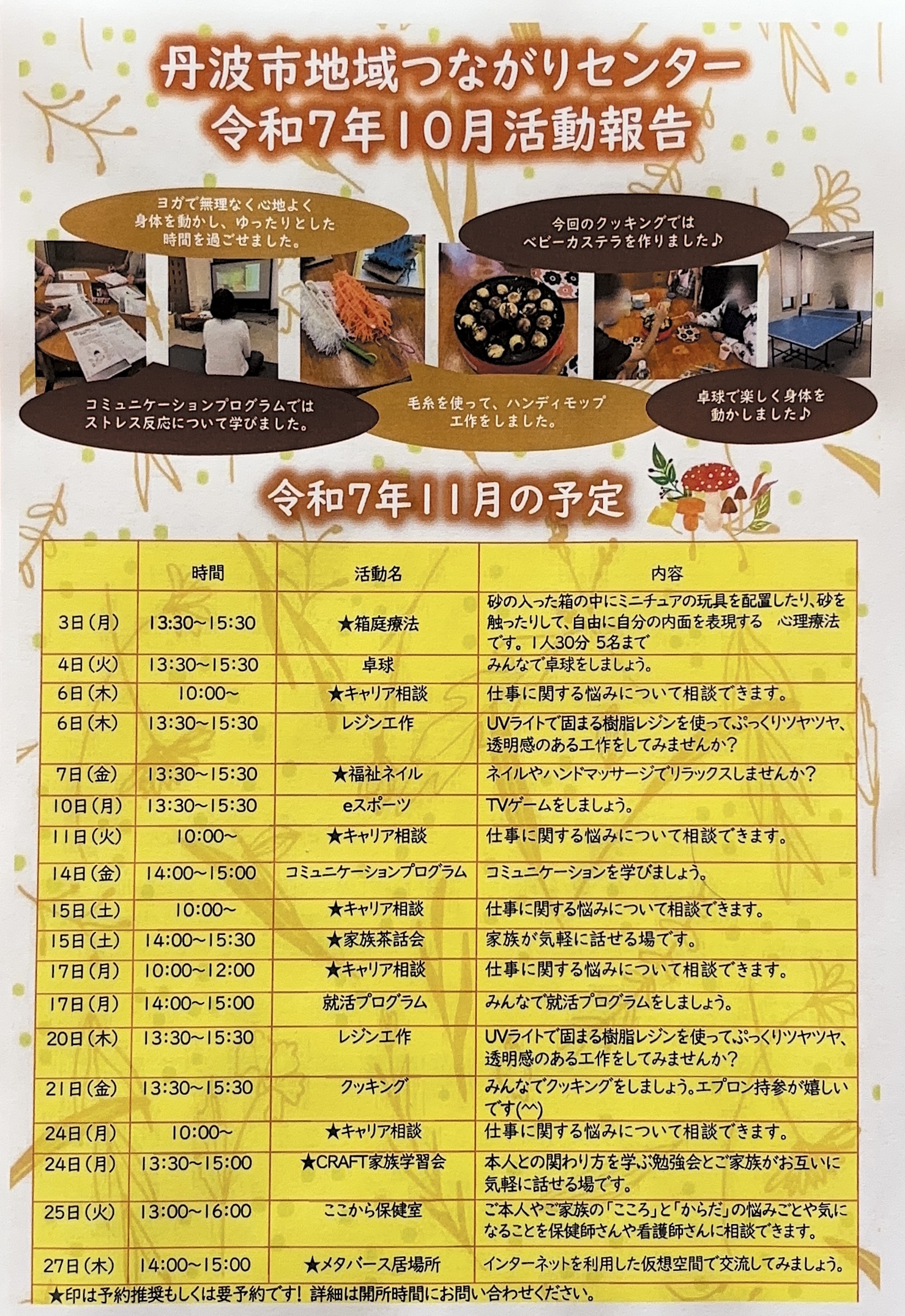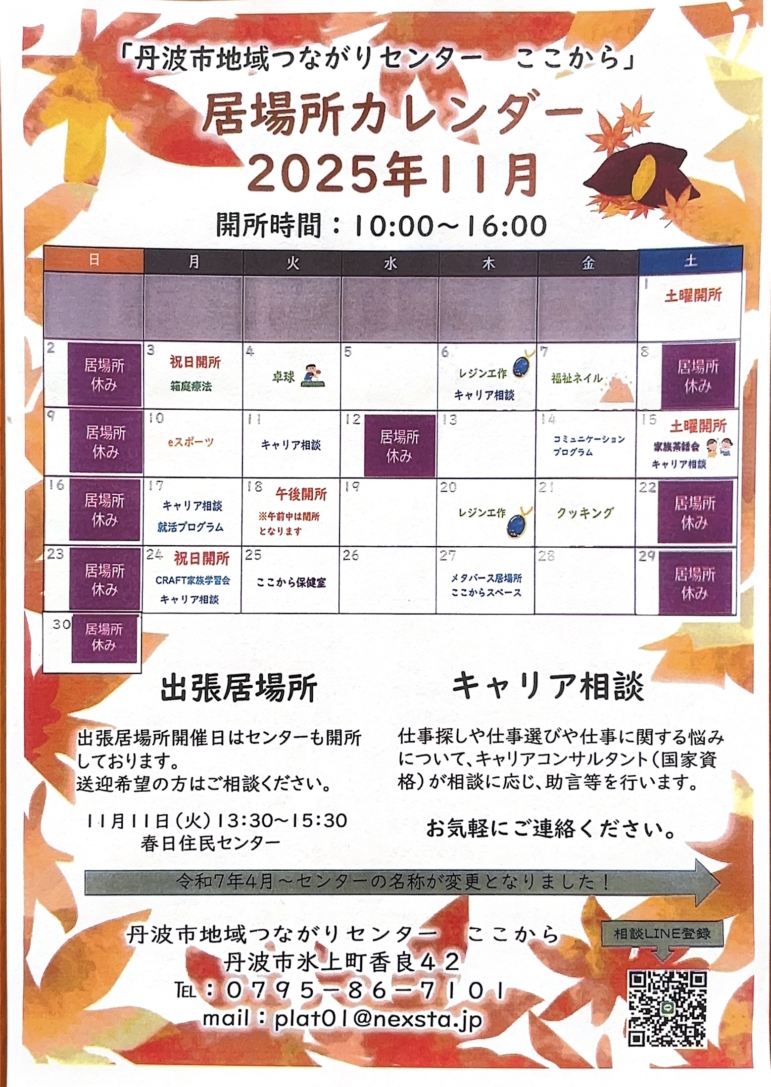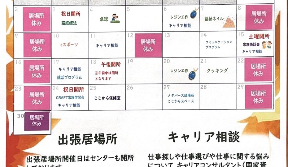 11月の『ここから』カレンダー 2025.10.31 2025.11.01 Tweet Share 記事のタイトルとURLをコピーする 『ここから』11月のカレンダーと10月の活動報告です (下段に印刷用PDFがあります) 11月カレンダー印刷用PDF Tweet Share 家族茶話会のお知らせ(下半期) 前の記事 11月の『ここから保健室』について 次の記事