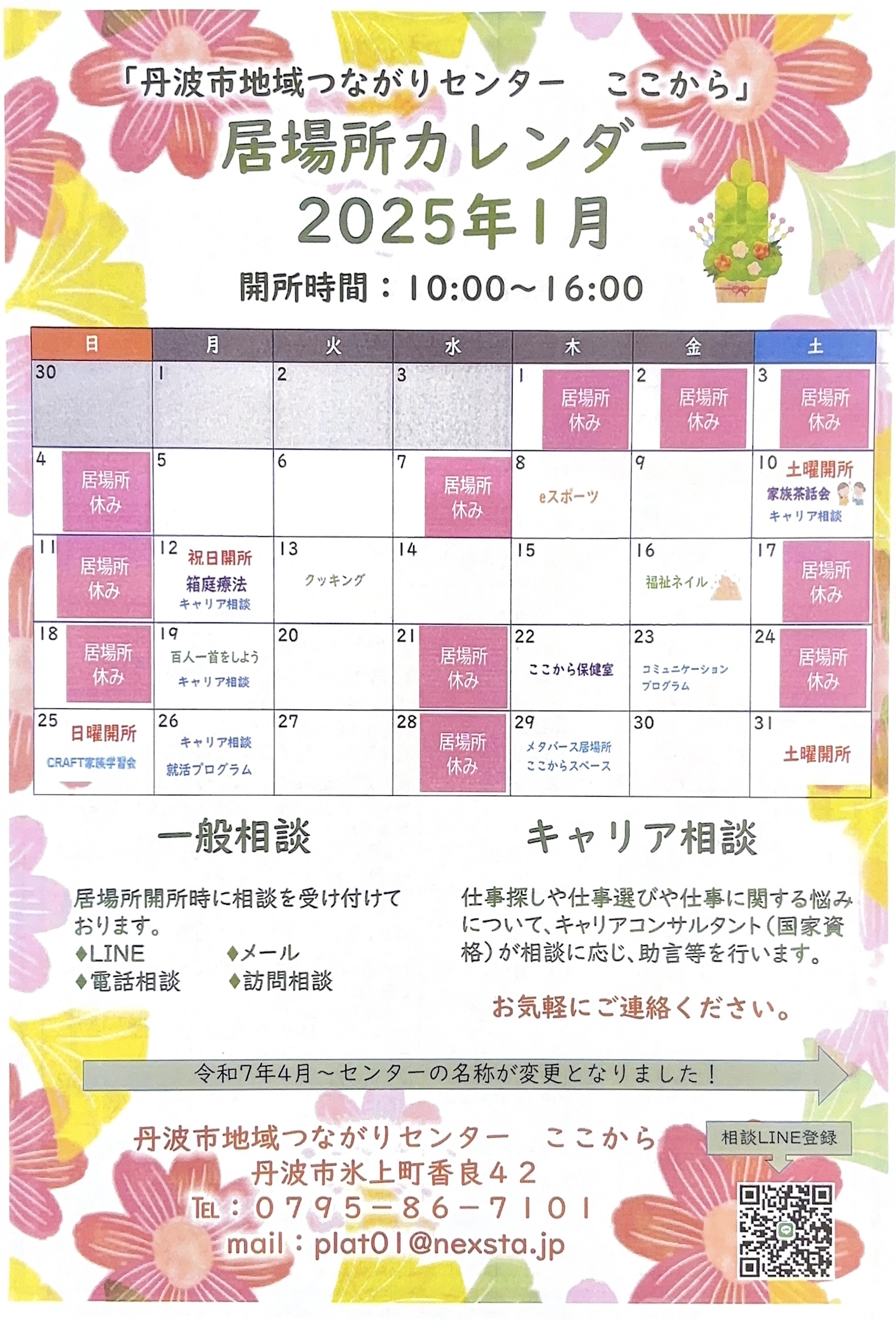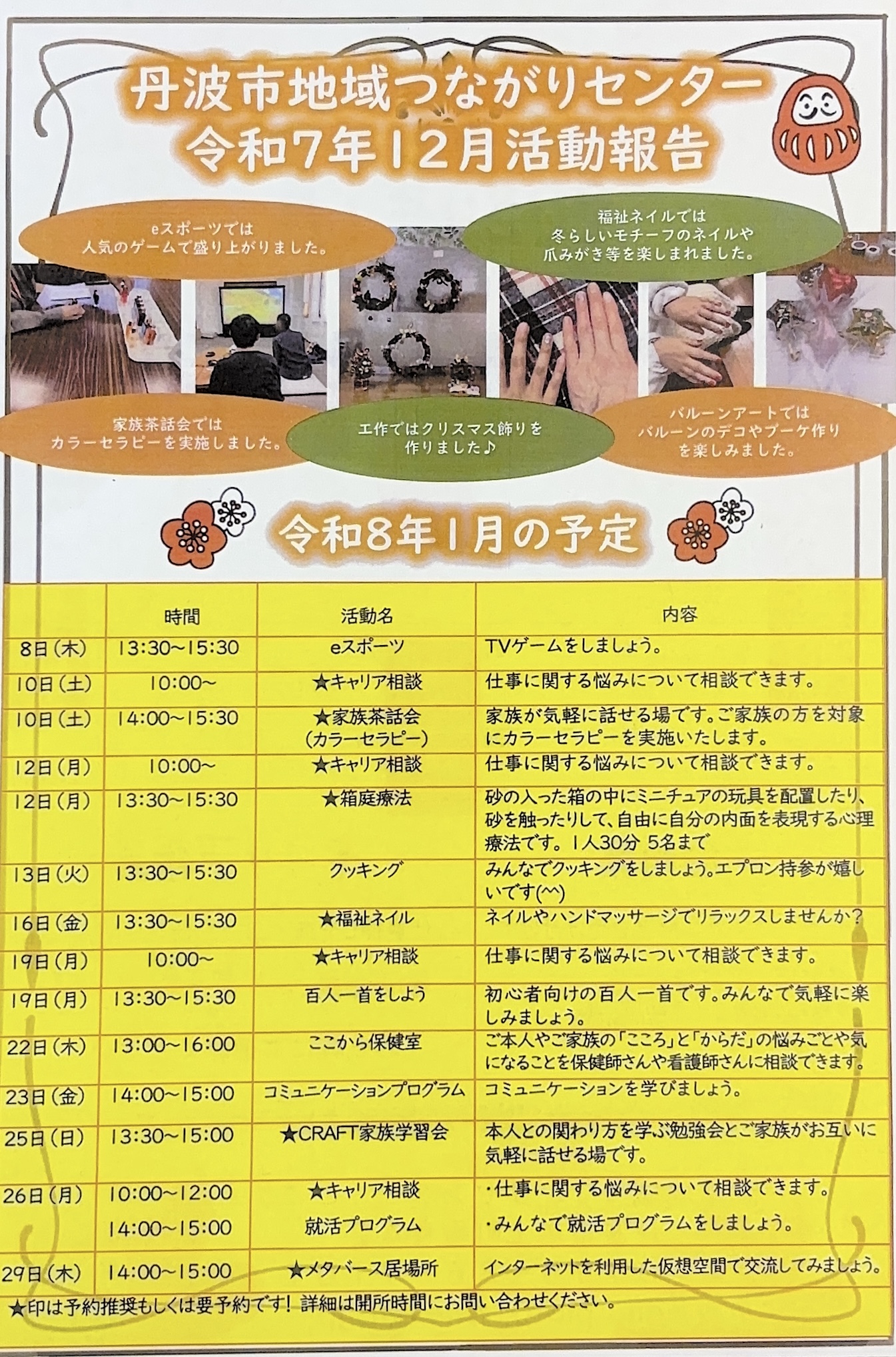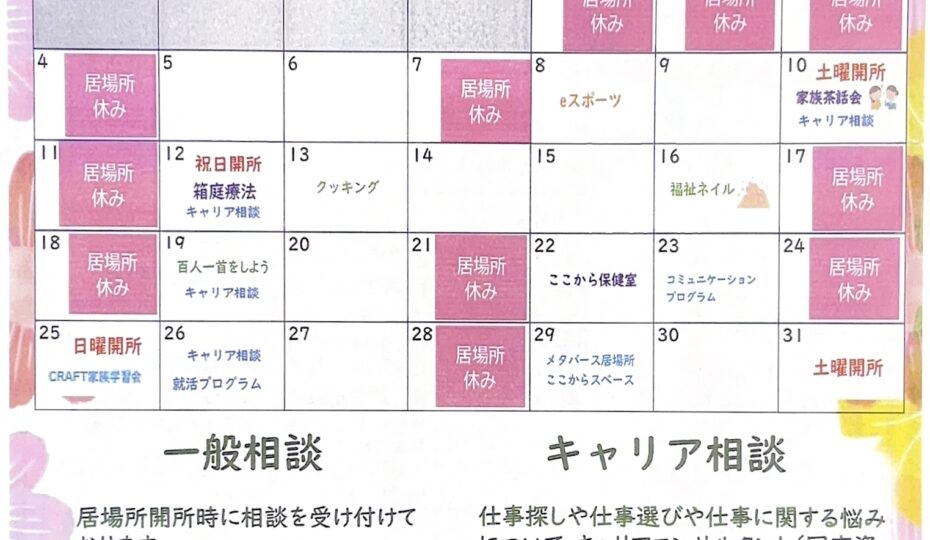 1月の『ここから』カレンダー 2026.01.01 Tweet Share 記事のタイトルとURLをコピーする 『ここから』1月のカレンダーと12月の活動報告です (下段に印刷用PDFがあります) ここからカレンダーR8.1月印刷用PDF Tweet Share 家族茶話会のお知らせ(下半期) 前の記事 1月の『ここから保健室』について 次の記事