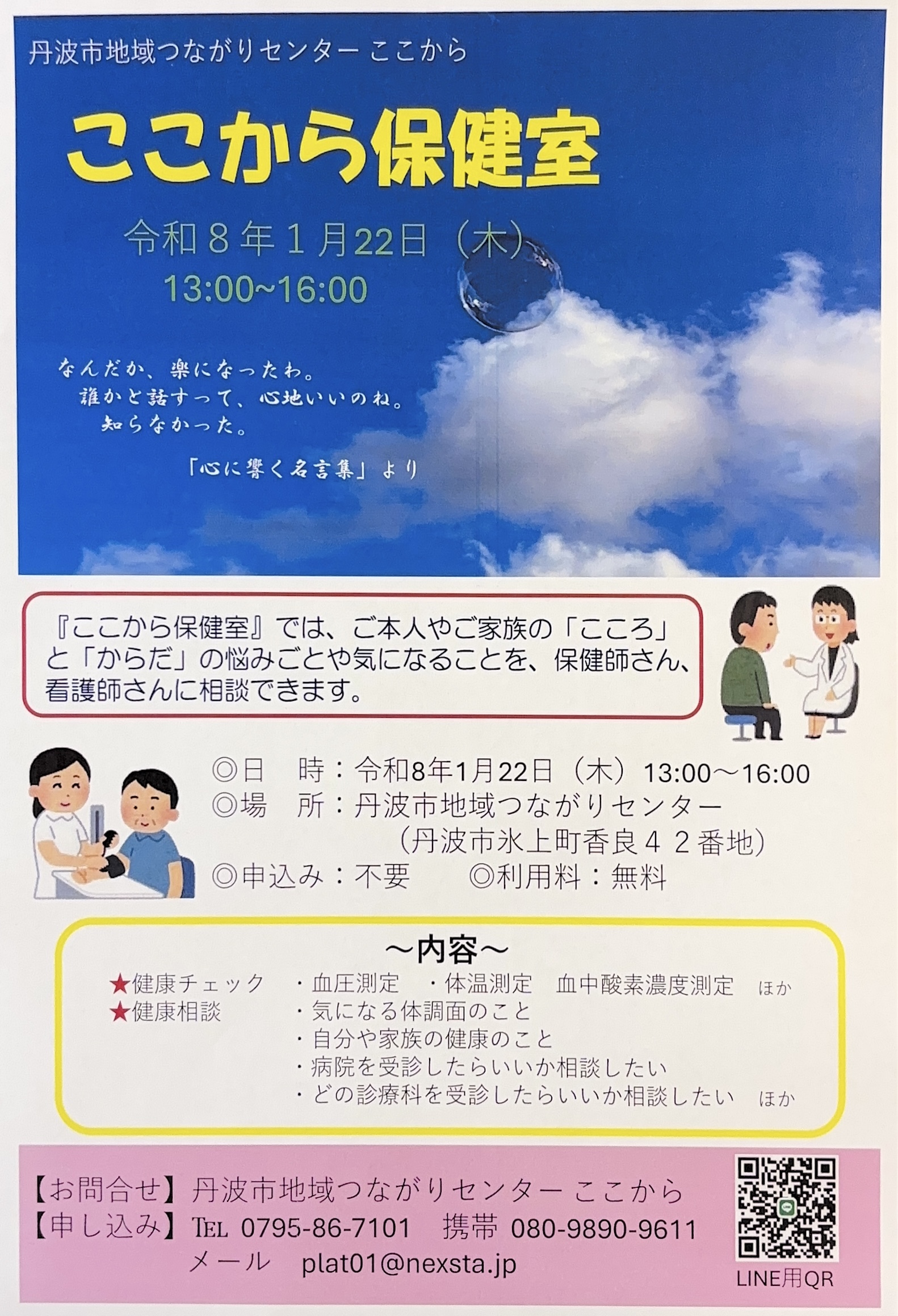 1月の『ここから保健室』について 2026.01.01 Tweet Share 記事のタイトルとURLをコピーする 1月の『ここから保健室』は1月22日(木)に行います 事前のご予約も承ります(当日受付も可能です) 1月保健室印刷用PDF Tweet Share 1月の『ここから』カレンダー 前の記事 1月のメタバース居場所「ここからスペース」の開催について 次の記事