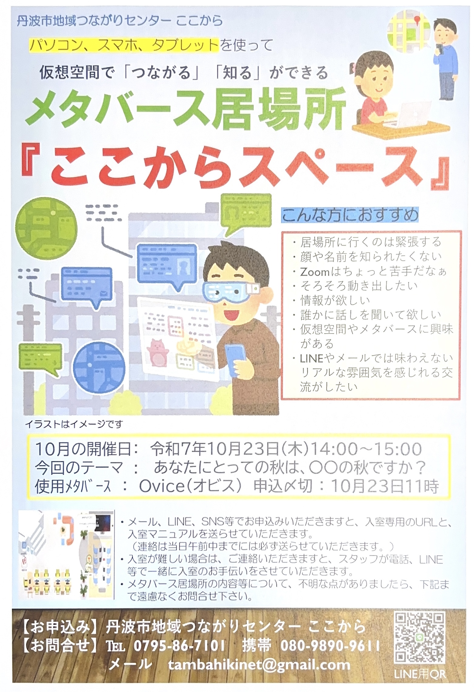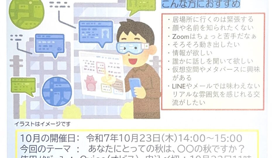10月のメタバース居場所「ここからスペース」の開催について 2025.09.30 Tweet Share 記事のタイトルとURLをコピーする 9月のメタバース居場所「ここからスペース」は10月23日(木)の14時より開催します 10月は「秋」についてお話し予定です 見学のみもOKです 興味・関心のある方は、チラシをご参考の上、お申込み・お問合せ下さい 10月ここからスペース印刷用PDF Tweet Share 10月の『ここから保健室』について 前の記事 ひきこもり・不登校・発達障がい学習会の開催(CRAFT・クラフト)・下半期 次の記事