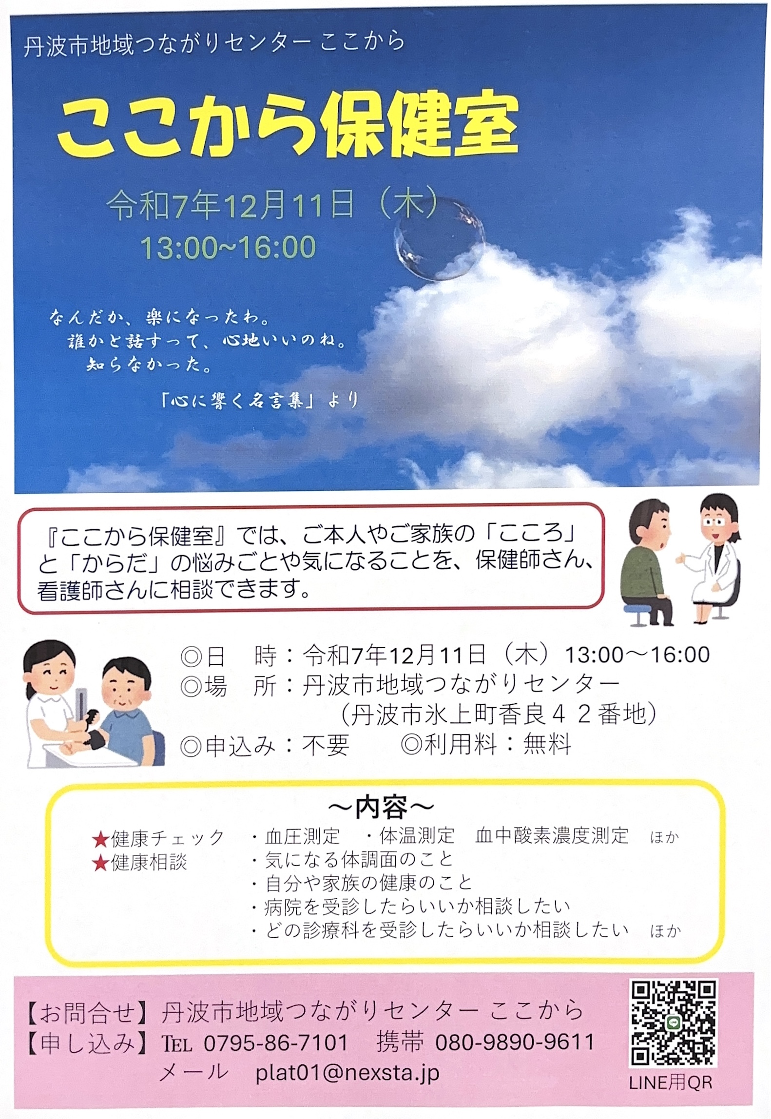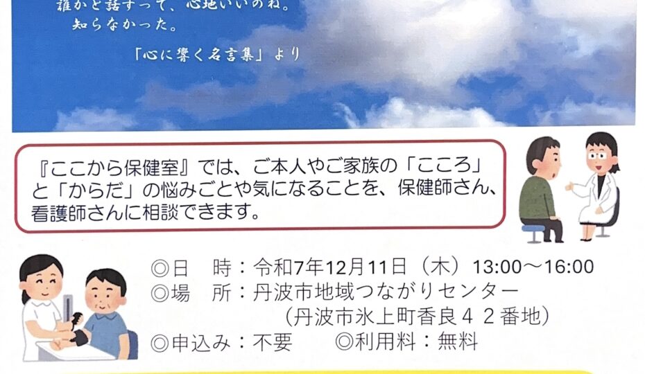 12月の『ここから保健室』について 2025.12.02 Tweet Share 記事のタイトルとURLをコピーする 12月の『ここから保健室』は12月11日(木)に行います ご予約受付中です(当日受付も可能です) 12月保健室チラシ Tweet Share 12月の『ここから』カレンダー 前の記事 12月のメタバース居場所「ここからスペース」の開催について 次の記事