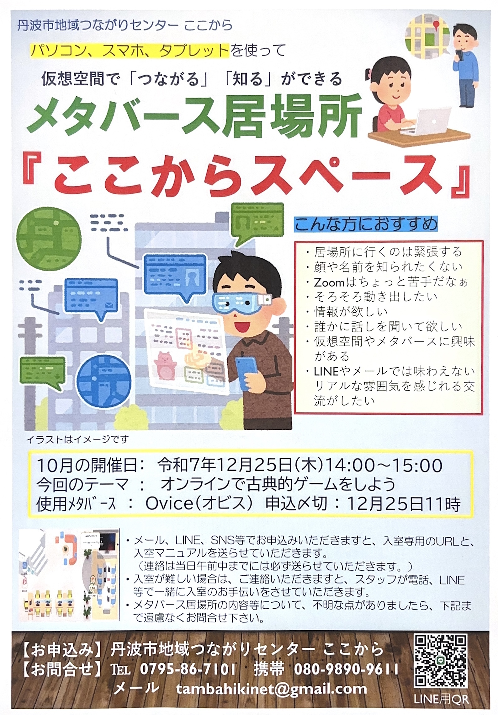 12月のメタバース居場所「ここからスペース」の開催について 2025.12.02 Tweet Share 記事のタイトルとURLをコピーする 12月のメタバース居場所「ここからスペース」は12月25日(木)の14時より開催します 12月も引き続き古典的ゲームを行う予定です 見学のみもOKです 興味・関心のある方は、チラシをご参考の上、お申込み・お問合せ下さい 12月ここからスペースチラシ Tweet Share 12月の『ここから保健室』について 前の記事