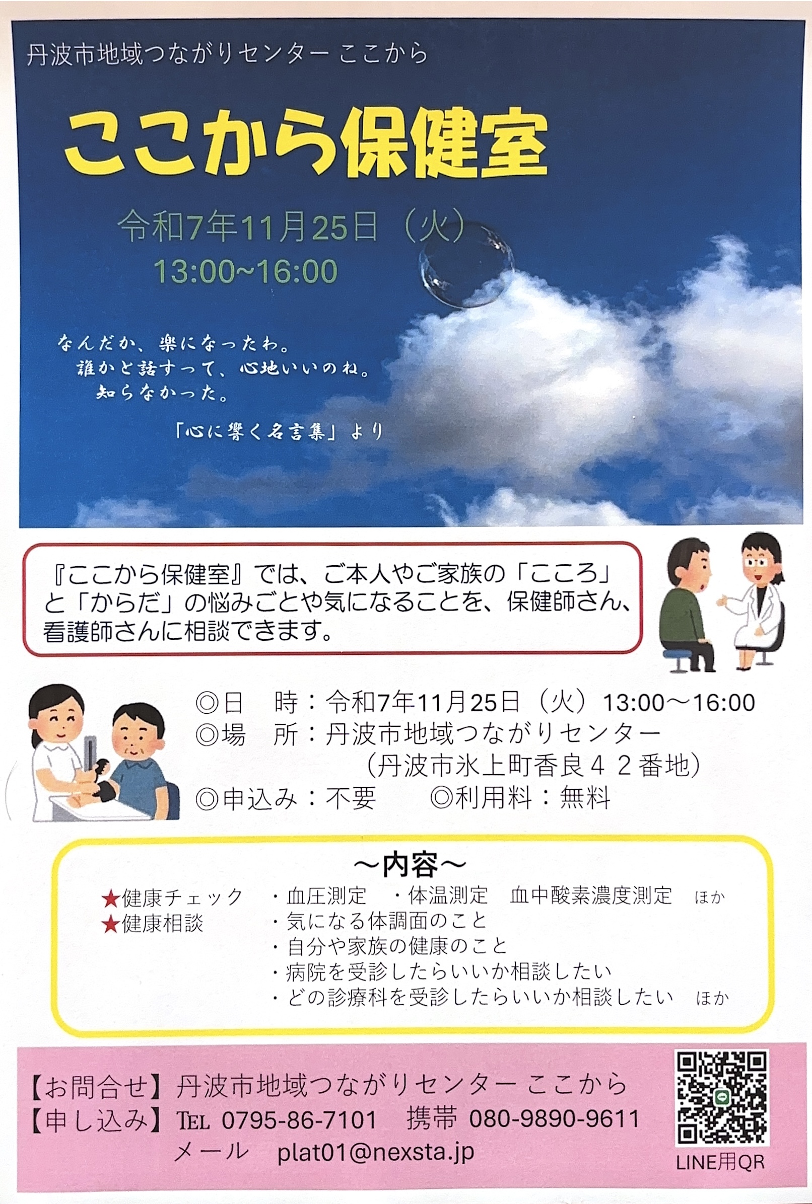 11月の『ここから保健室』について 2025.11.01 Tweet Share 記事のタイトルとURLをコピーする 11月の『ここから保健室』は11月25日(火)に行います ご予約受付中です 11月保健室チラシ印刷用PDF Tweet Share 11月の『ここから』カレンダー 前の記事 11月のメタバース居場所「ここからスペース」の開催について 次の記事